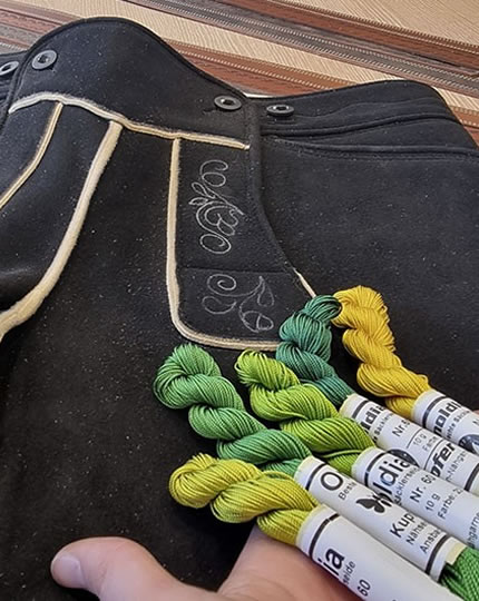 Sie wählen aus, in welcher Farbe Ihre Lederhose handbestickt wird. Für den Stick verwendet unsere Säcklerin Barbara Maulbeerseide.