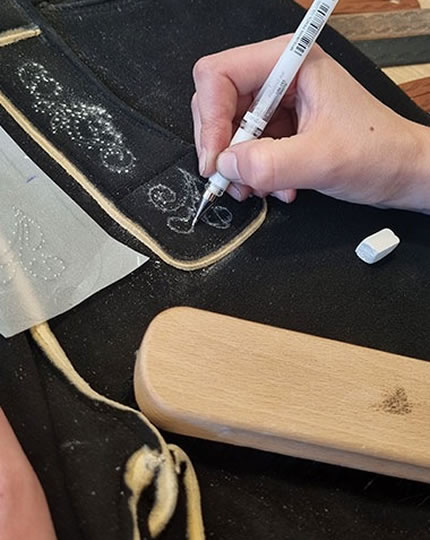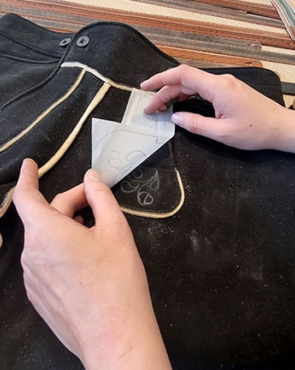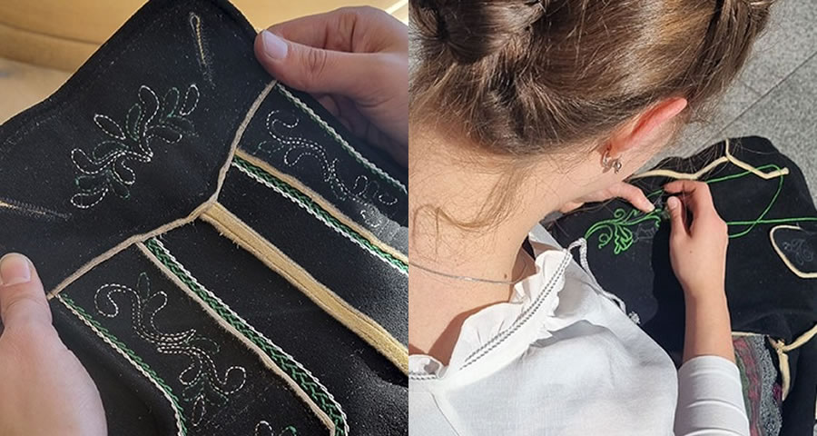 Mit ihrer mehrjährigen Berufserfahrung bestickt sie in Handarbeit unsere kurzen Lederhosen als auch Kniebundhosen.